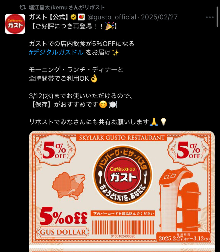 堀江晶太さんが自身が関わった楽曲などのポストを大量にRPしたあと、ガスト公式の「ガストの店内飲食で使える5%offクーポン」のお知らせをRPされました。