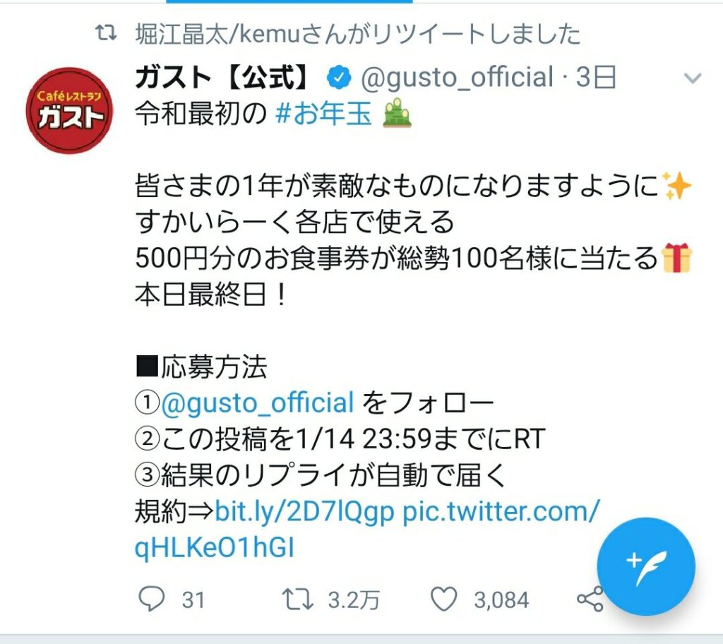 堀江氏がまたもや「ガスト」の抽選をされた模様です。しかし、14日までにRTする必要があるため、無駄なリツイートとなってしまいました。