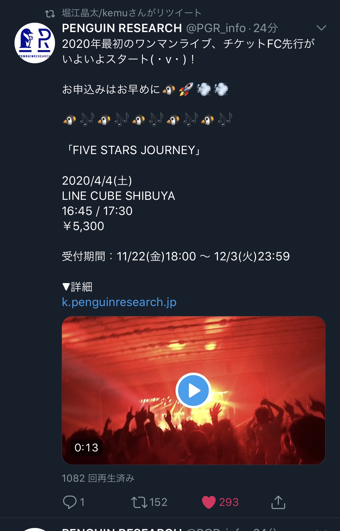 URLをコピーしました! 最近Twitterしがちな堀江晶太さんが、PGR公式のツイートをRTしました。 ワンマン申し込みはお早めに。 共有:クリックして Twitter で共有 (新しいウィンドウで開きます)Facebook で共有するにはクリックしてください (新しいウィンドウで開きます) 関連 全ての記事 この記事が気に入ったら フォローしてね! Follow @hs_news_update よかったらシェアしてね! URLをコピーしました! URLをコピーしました! 【LiSA×SAO×草野華余子×堀江晶太】祝・紅白出場! LiSAさん最新曲「unlasting」MV公開! 【速報】堀江晶太/kemuさん 6日ぶりにリツイートされる 関連記事 【棗いつき×草野華余子×堀江晶太】#M3秋2025 リリースの草野華余子提供新曲「Rage Against The Euphoria」にギターで参加! 2025年10月18日 【じん×石風呂×ゆーまお×岸田勇気×堀江晶太】ネクライトーキー初主催フェスにてチーム自主休講として出演! 2025年10月10日 【にゅ~カル派!✕大橋彩香✕sabio✕峰月律✕堀江晶太】トークセッション「にゅ~カル派!vol.1」が開催! 2025年10月10日 【悠佑(いれいす)×堀江晶太】いれいすきってのロックシンガーが”ホリロック”を歌い回す!アルバムリード曲「limbo?」提供! 2025年10月10日 【七海うらら×暗殺教室×草野華余子×堀江晶太】BLACK ALBATROSS編曲「Infinity karat / 七海うらら」ギター演奏! 2025年10月3日 【速報】世界トップVTuberと世界トップボカロPが禁断のコラボ!じん×堀江晶太によるmiComet新曲『Lollipop』公開! 2025年10月2日 堀江晶太 × 星銀乃丈まさかの師弟対決!?12月、大阪吹田にてアニソン塾開講! 2025年9月24日 【あんスタ!!✕エリオスR✕松井洋平✕篠崎あやと✕堀江晶太】今年もやってきた!あんスタエリオス特大コラボ記念楽曲を作曲!共同編曲には篠崎あやと! #あんスタ #エリオスR 2025年9月22日