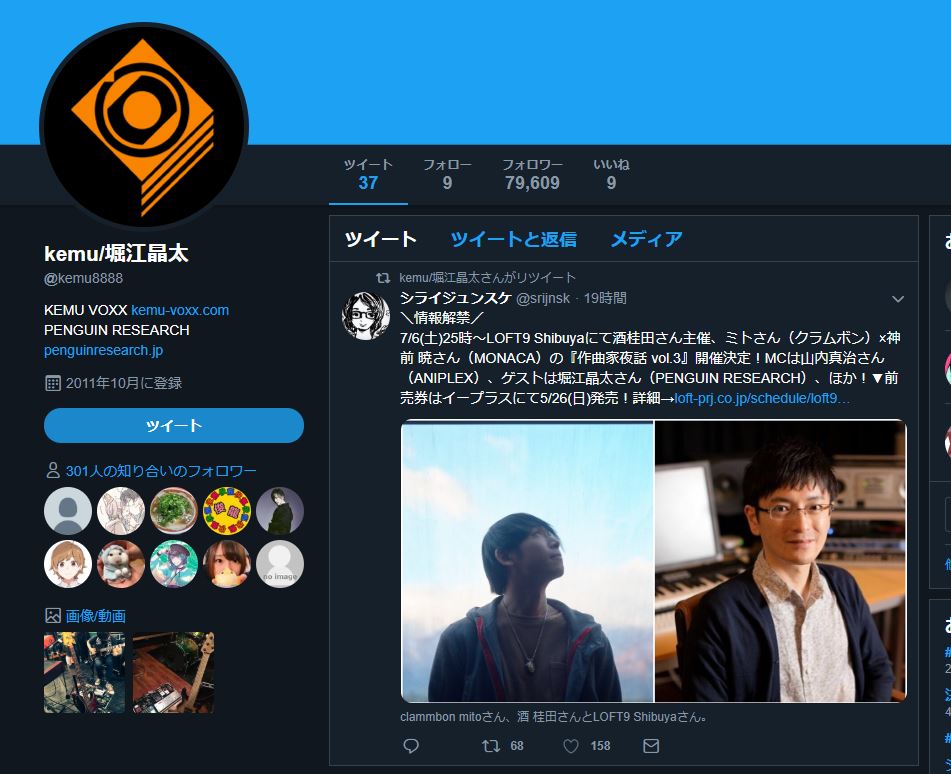 URLをコピーしました! 昨日お伝えした「作曲家夜話」に関する内容をリツイートされた模様。 前回実施時もリツイートされてたので、思い入れのあるイベントなのでしょう。 共有:クリックして Twitter で共有 (新しいウィンドウで開きます)Facebook で共有するにはクリックしてください (新しいウィンドウで開きます) 関連 全ての記事 kemu ツイート この記事が気に入ったら フォローしてね! Follow @hs_news_update よかったらシェアしてね! URLをコピーしました! URLをコピーしました! 【LiSA×堀江晶太】LiSA ASiA TOUR 2018 アニメーションBGMを担当! 【天神子兎音×堀江晶太(kemu) コラボ楽曲公開記念】VTuber 天神子兎音さんについてまとめてみた! #ことね教 関連記事 【田淵智也×堀江晶太】田淵智也生誕40周年ソロカバーアルバム収録「デネブとスピカ」にリアレンジ&ゲストボーカルで参加! 2025年11月2日 【棗いつき×草野華余子×堀江晶太】#M3秋2025 リリースの草野華余子提供新曲「Rage Against The Euphoria」にギターで参加! 2025年10月18日 【じん×石風呂×ゆーまお×岸田勇気×堀江晶太】ネクライトーキー初主催フェスにてチーム自主休講として出演! 2025年10月10日 【にゅ~カル派!✕大橋彩香✕sabio✕峰月律✕堀江晶太】トークセッション「にゅ~カル派!vol.1」が開催! 2025年10月10日 【悠佑(いれいす)×堀江晶太】いれいすきってのロックシンガーが”ホリロック”を歌い回す!アルバムリード曲「limbo?」提供! 2025年10月10日 【七海うらら×暗殺教室×草野華余子×堀江晶太】BLACK ALBATROSS編曲「Infinity karat / 七海うらら」ギター演奏! 2025年10月3日 【速報】世界トップVTuberと世界トップボカロPが禁断のコラボ!じん×堀江晶太によるmiComet新曲『Lollipop』公開! 2025年10月2日 堀江晶太 × 星銀乃丈まさかの師弟対決!?12月、大阪吹田にてアニソン塾開講! 2025年9月24日
