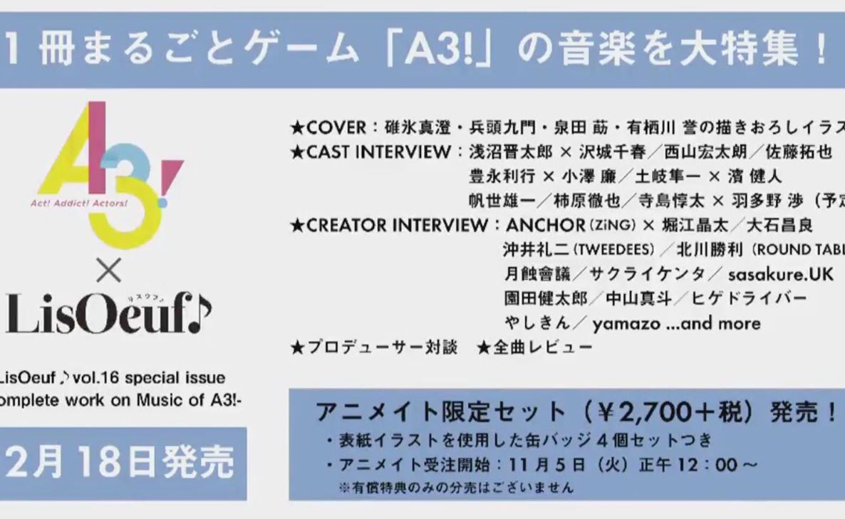 LisOeuf A3!コラボ号(12/18)に、堀江氏とANCHORさんのインタビューが掲載されることが判明しました。